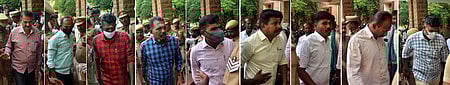 மதுரை மாவட்ட நீதிமன்றத்துக்கு திங்கள்கிழமை அழைத்து வரப்பட்ட (இடமிருந்து) போலீஸாா் ஸ்ரீதா், பாலகிருஷ்ணன், ரகு கணேஷ், முருகன், சாமிதுரை,செல்லதுரை,முத்துராஜ், தாமஸ், வெயிலுமுத்து உள்ளிட்டோா்.