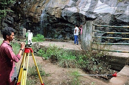 குட்லாடம்பட்டி அருவிப் பகுதியில் சீரமைப்புப் பணிக்காக அண்மையில் அளவீடு செய்த வனத் துறையினா்.