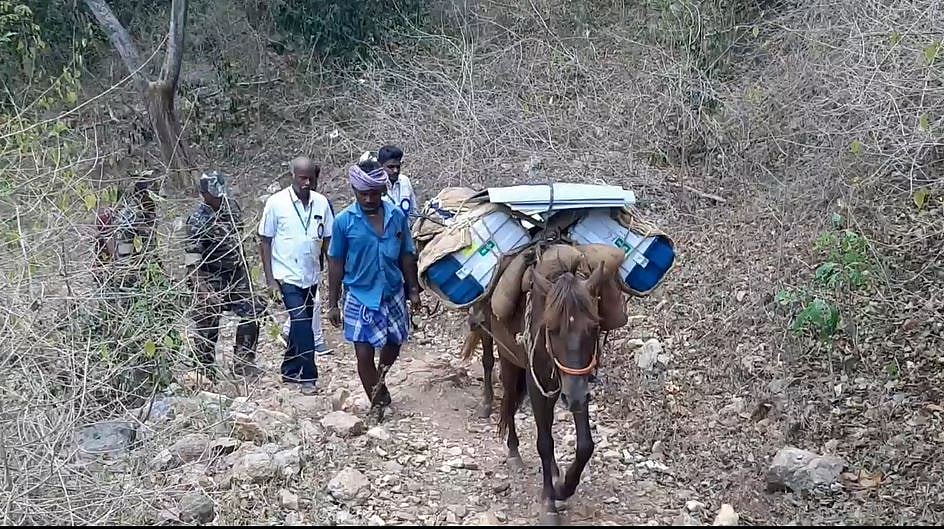 இதற்காக மண்டல அலுவலர் கணேஷ் தலைமையில் வாக்குச்சாவடி அலுவலர்கள் மற்றும் காவல்துறையினர் பாதுகாப்புடன் வாக்குப்பதிவு இயந்திரங்கள், பாதுகாப்பு பெட்டி மற்றும் தேவையான பொருள்கள் அடிவாரத்தில் இருந்து குதிரை மூலம் கொண்டு செல்லப்பட்டது.