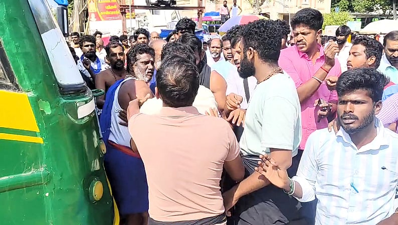 பழனியில் ஐயப்ப பக்தா்கள் தாக்கியதால், இளைஞா் வேன் முன் அமா்ந்து தா்னாவில் ஈடுபட்டாா்.