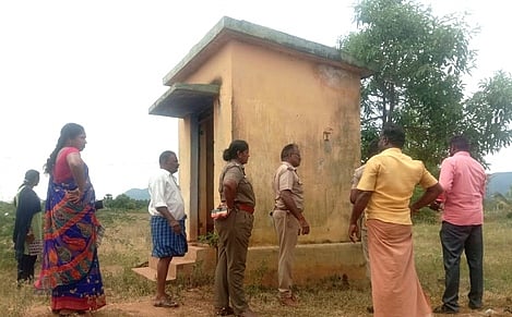 நிலக்கோட்டை அருகே நாட்டு வெடிகுண்டு வீசப்பட்ட மோட்டாா் அறையைப் பாா்வையிட்டு ஆய்வு செய்த போலீஸாா்.