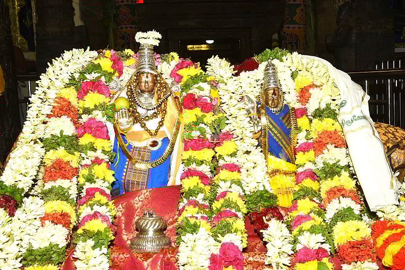 கொடிமரம் அருகே எழுந்தருளிய தம்பதி சமேத இலக்குமி நாராயணப் பெருமாள்.