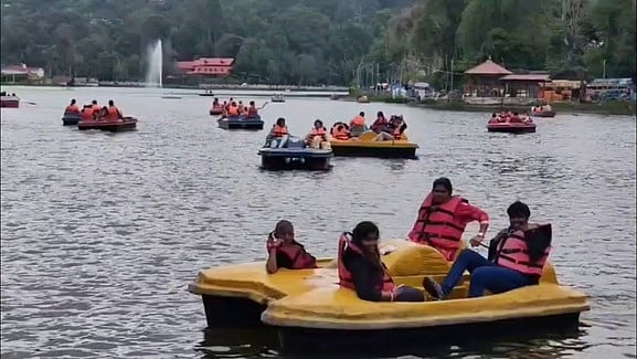 கொடைக்கானல் நட்சத்திர ஏரியில் படகு சவாரி செய்து மகிழும் சுற்றுலாப் பயணிகள்.