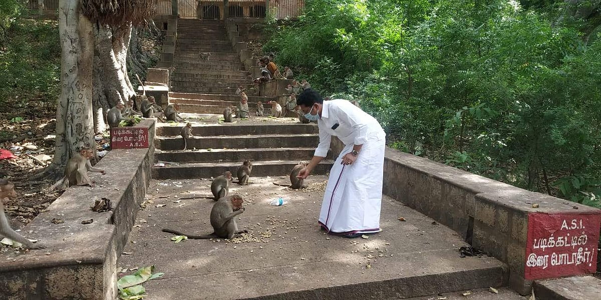 திருப்பரங்குன்றத்தில் குரங்குகள், மயில்களுக்கு உணவு வழங்கிய எம்எல்ஏ
