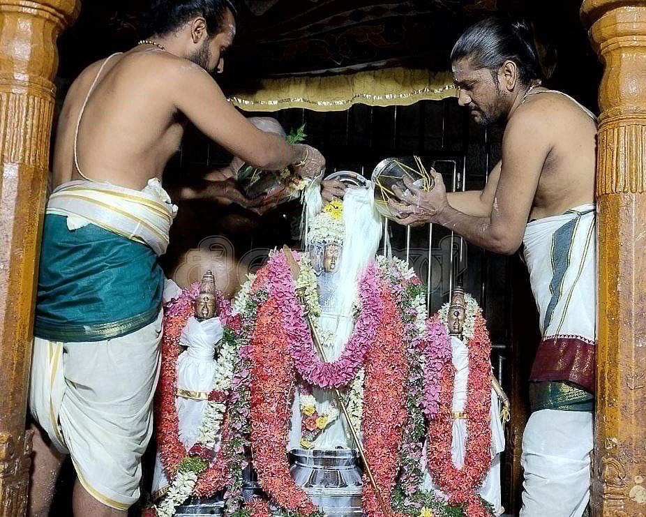 வைகாசி விசாகத்தை முன்னிட்டு சண்முகர் வள்ளி தெய்வானைக்கு பாலாபிஷேகம் செய்யும் ஸ்தானிகபட்டர்கள்.