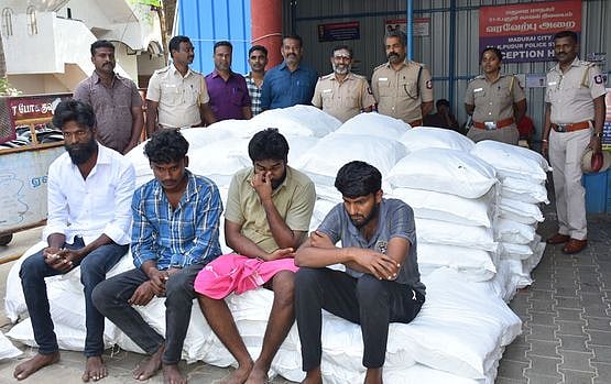 மதுரை கோ. புதூா் போலீஸாரால் பறிமுதல் செய்யப்பட்ட குட்கா மூட்டைகள், கைது செய்யப்பட்டவா்கள்.