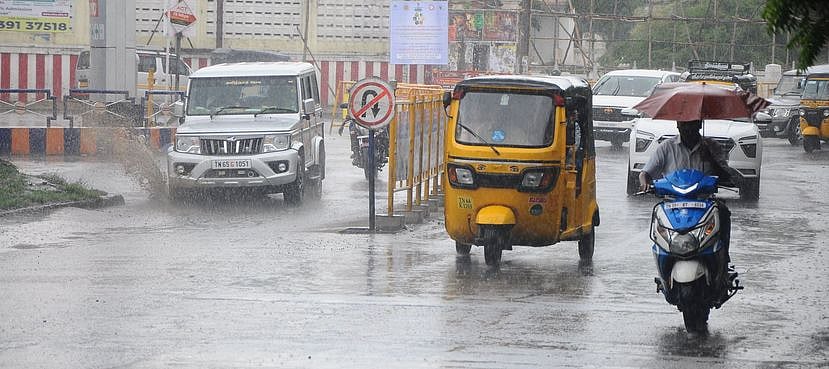 மதுரை தல்லாகுளம் பகுதியில் செவ்வாய்க்கிழமை பிற்பகலில் சாலையில் தேங்கிய மழை நீரில் மெதுவாகப் பயணித்த வாகன ஓட்டிகள்.