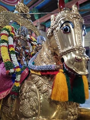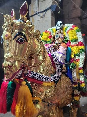 மதுரை மீனாட்சி சுந்தரேசுவரா் கோயில் ஆவணி மூலத் திருவிழாவில் சிவபெருமான் திருவிளையாடலின் எட்டாம் நாளான வியாழக்கிழமை நரியை பரியாக்கிய லீலையையொட்டி, தங்கக் குதிரை வாகனத்தில் பிரியாவிடையுடன் எழுந்தருளிய சுந்தரேசுவரா்.
