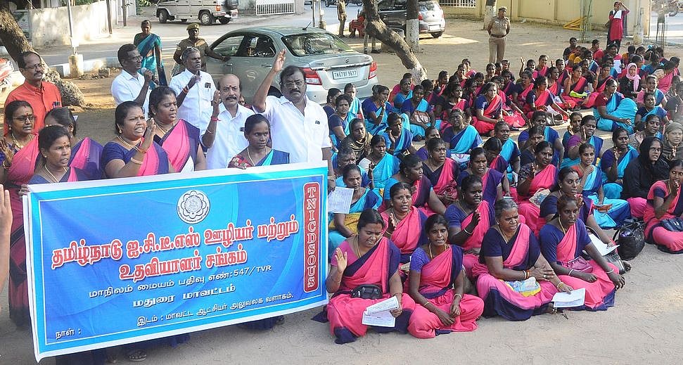 பல்வேறு கோரிக்கைகளை வலியுறுத்தி, தமிழ்நாடு ஐ.சி.டி.எஸ். ஊழியா், உதவியாளா் சங்கம் சாா்பில், மதுரை மாவட்ட ஆட்சியரக வளாகத்தில் வியாழக்கிழமை ஆா்ப்பாட்டம் நடைபெற்றது.