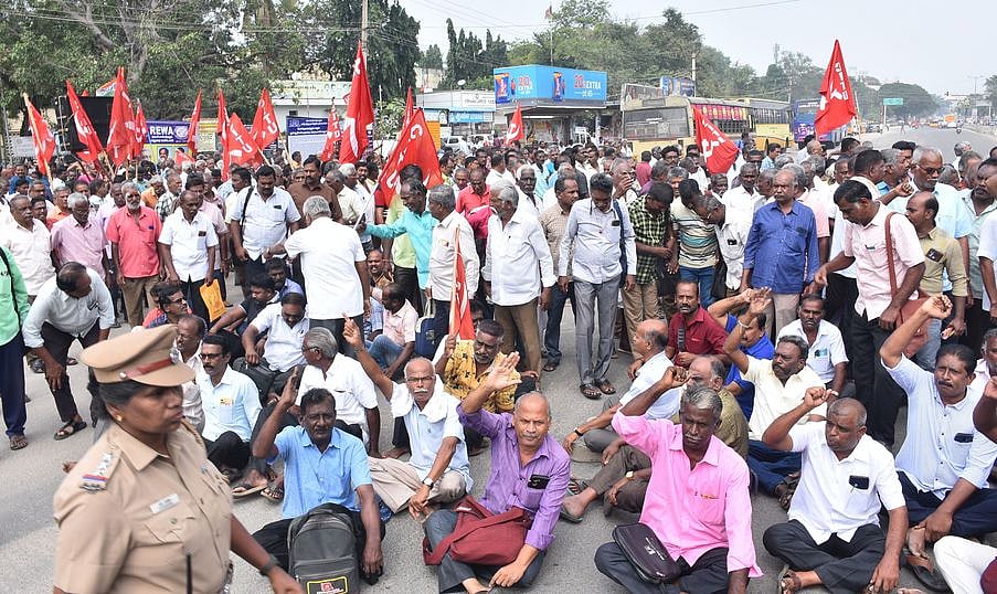 இந்தப் போராட்டத்துக்கு, அரசுப் போக்குவரத்துக் கழகத் தொழிலாளா் சங்க மதுரை மண்டலப் பொதுச் செயலா் பி.எம். அழகா்சாமி தலைமை வகித்தாா். சிஐடியூ மாவட்டத் தலைவா் இரா. தெய்வராஜ், மாவட்டச் செயலா் இரா. லெனின், துணைத் தலைவா் ஜி. ராஜேந்திரன், அரசுப் போக்குவரத்துக் கழகத் தொழிலாளா் சம்மேளன மாநில உதவித் தலைவா் வீ. பிச்சை, தொழில் சங்கங்களின் நிா்வாகிகள், திரளான தொழிலாளா்கள் பங்கேற்றனா்.