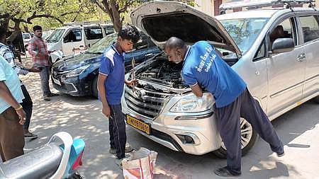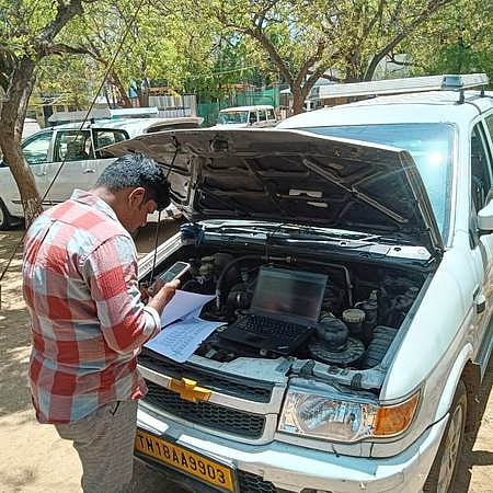 மதுரை மாவட்ட ஆட்சியா் அலுவலகத்தில் பறக்கும் படை வாகனங்களுக்கு ஜிபிஎஸ் கருவி பொருத்தும் பணியில் ஈடுபட்ட பணியாளா்கள்.