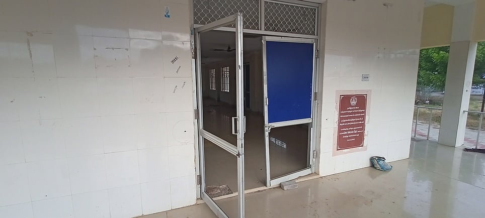 பசும்பொன் தேவா் நினைவிடம் எதிரே உள்ள தியான மண்டபத்தில் உடைக்கப்பட்ட கண்ணாடி கதவுகள்.