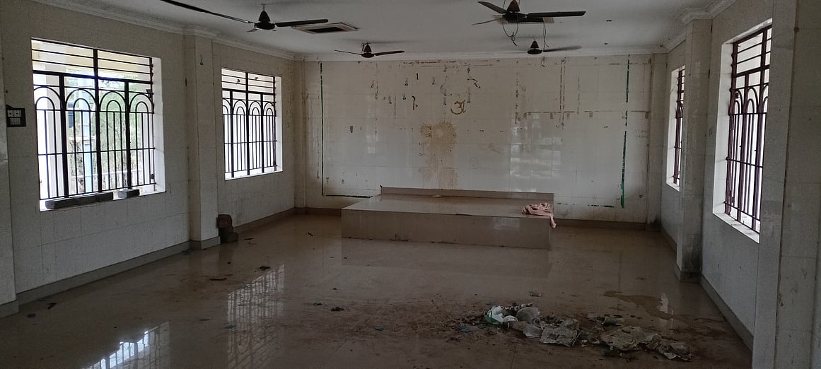 தியான மண்டபத்துக்குள் கிடந்த மதுபுட்டி, சிகரெட் பொட்டலங்கள்.