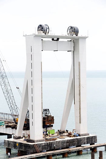 பாம்பன் புதிய ரயில்வே பாலத்தின் மையப் பகுதியில் பொருத்தப்படும் இழுவை இயந்திரம்.