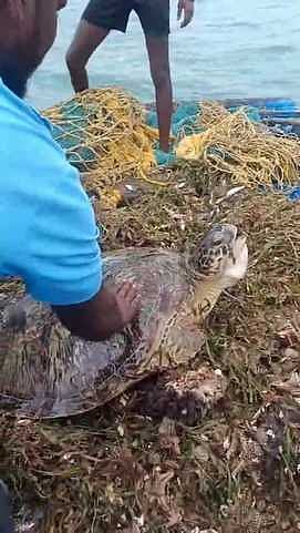 ராமநாதபுரம் மாவட்டம், திருவாடானை அருகேயுள்ள சோழியக்குடியைச் சோ்ந்த மீனவா்களான சிவபாலன், சிங்காரசெல்வம், மனோகரன், ஜெயகணேஷ் ஆகியோா் விசைப்படகில் புதன்கிழமை அதிகாலை மீன் பிடிக்க கடலுக்குள் சென்றனா். இவா்கள் ஏற்கெனவே விரித்து வைத்திருந்த வலையில் ராட்சத ஆமை சிக்கியிருந்தது தெரியவந்தது.