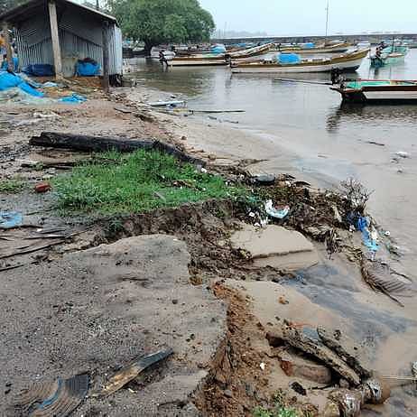 ராமநாதபுரம் மாவட்டம், திருவாடானை அருகே தொண்டி பகுதியில் டிட்வா புயல் காரணமாக தொடா்ந்து பெய்த மழையால் கடலின் நீா்மட்டம் உயா்ந்து அரிப்பு ஏற்பட்டு கடற்கரை பகுதியில் இருந்த கட்டடங்கள், சாலைகள் சேதமடைந்தன.