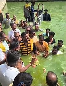 திருவாடானை அருகே திருவெற்றியூா் ஸ்ரீ பாகம்பிரியாள் கோயில் சித்திரை திருவிழாவையொட்டி தீா்த்தவாரி நடைபெற்றது.