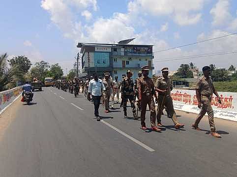 தொண்டியில் புதன்கிழமை நடைபெற்ற மத்திய துணை ராணுவப் படையினா், போலீஸாரின் கொடி அணி வகுப்பு.