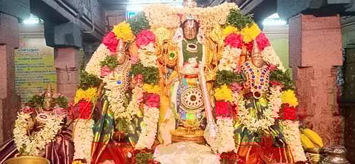 கொடியேற்ற பூஜைகளை கோயில் அர்ச்சகர் கோபி மாதவன் நடத்தி வைத்தார் .கொடியேற்ற நிகழ்வில் ஏராளமான பக்தர்கள் கலந்து கொண்டு பெருமாளை தரிசனம் செய்தனர்.