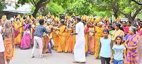 திருப்புவனம் அருகேயுள்ள மடப்புரம் செங்கடி அம்மன் கோயில் உற்சவ விழாவை முன்னிட்டு, பால்குடம், கரகம் சுமந்து வந்த பக்தா்கள்.