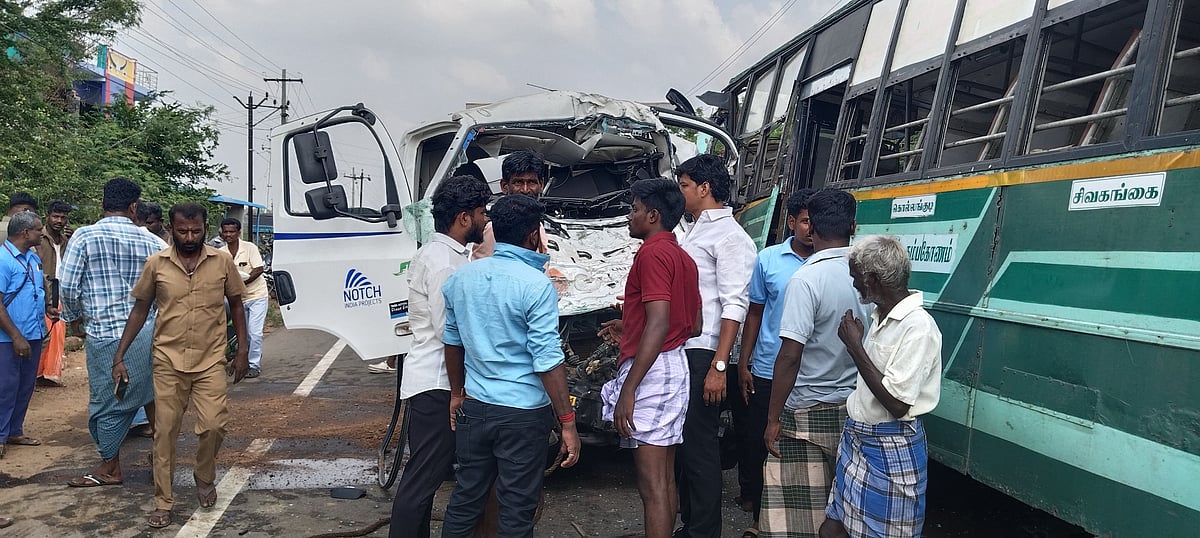 சிவகங்கை நோக்கிச் சென்ற டீசல் லாரி, முன்னே சென்ற வாகனத்தை முந்த முயன்றபோது, எதிரே மதுரை நோக்கி வந்த அரசு பேருந்துடன் நேருக்கு நேர் மோதியது.