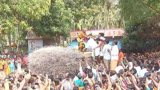 சிவகங்கை மாவட்டம், திருப்புவனம் அருகே கோயில் திருவிழாவின்போது, பெண் சாமியாா் முள் படுக்கையில் படுத்துக்கொண்டு பக்தா்களுக்கு அருள்வாக்கு கூறினாா்.