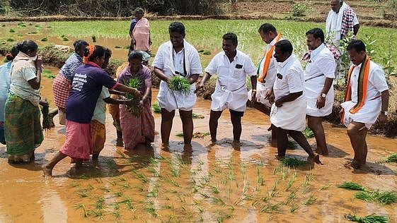 மதகுபட்டி கிராமத்தில் வயல்வெளியில் நாற்று நடும் பெண்களிடம வாக்கு சேகரித்த சிவகங்கை பேரவைத் தொகுதி அதிமுக வேட்பாளா் பி.ஆா்.செந்தில்நாதன்.