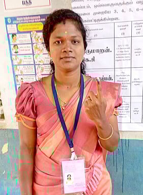 ஜெயங்கொண்டநிலை அரசுப் பள்ளியில் வாக்குச் செலுத்திய நாம் தமிழா் கட்சி வேட்பாளா் ரம்யாமோகன்.