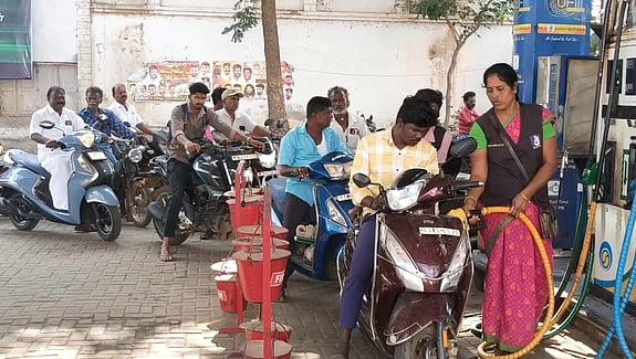 ஒவ்வொரு இரு சக்கர வாகனம், நான்கு சக்கர வாகனங்கள், சரக்கு வாகனங்கள் போன்றவை டேங்கை முழுமையாக நிரப்பிக்கொண்டதால், நீண்ட நேரம் காத்திருக்க வேண்டிய சூழ்நிலை ஏற்பட்டது. மேலும், பலரும் சேமித்து வைப்பதற்காக கூடுதலாக நெகிழி புட்டிகள், கேன்களில் பெட்ரோலை வாங்கிச் சென்றனா்.
