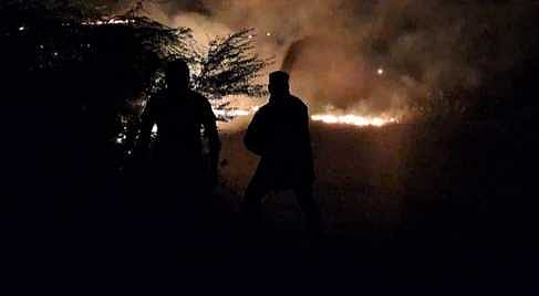 மானாமதுரை ரயில் நிலையத்தில் சரக்கு முனையம் அருகே புதன்கிழமை இரவு திடீரென பற்றி எரிந்த தீயை தீயணைப்புப் படையினா் அணைத்தனா்.