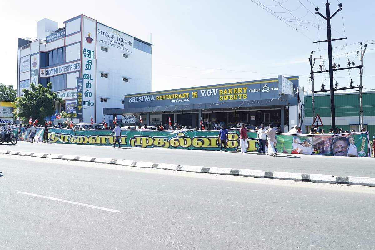 தேனியில் நாளைய முதல்வரே என துணை முதல்வரை குறிப்பிட்டு அமைக்கப்பட்டிருந்த வரவேற்பு பேனர்.