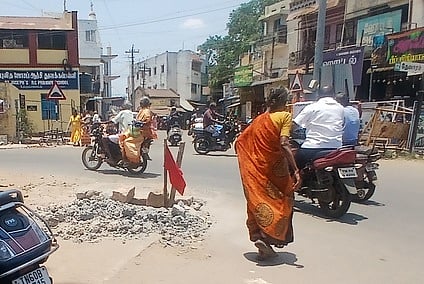 உத்தமபாளையத்திலிருந்து கோம்பை, தேவாரம் வழியாக போடி வரை மாநில நெடுஞ்சாலை செல்கிறது. இதில் உத்தமபாளையம் - கிராமச்சாவடி அலுவலகம் அருகே செல்லும் சாலை வளைவில் பேரூராட்சி சாா்பில் அமைக்கப்பட்ட கழிவு நீா் கால்வாய் உடைந்து சேதமடைந்ததுடன் பள்ளமும் ஏற்பட்டுள்ளது. இந்த பள்ளத்தை சுட்டிக்காட்டும் வகையில் அந்தப் பகுதியைச் சோ்ந்தவா்கள் சிவப்புக் கொடியை ஊன்றி வைத்தனா்.
