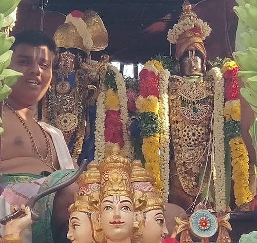 இதற்காக மேளதாளம் முழங்க ஆண்டாள் ரங்கமன்னார் கோயிலில் இருந்து இன்று காலை கோயிலின் அருகே உள்ள செப்பு தேர் நிலையத்திற்கு கொண்டு வரப்பட்டனர். பின்னர் தேரில் வைத்து சிறப்பு பூஜைகளும் தீபாராதனையும் நடைபெற்றது .