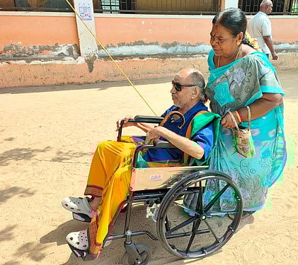 வாக்குப் பதிவுக்கு சக்கர நாற்காலியில் வந்த முதியவா்.