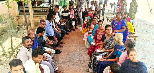 காரைக்கால் நகரப் பகுதி வாக்குச்சாவடியில் வாக்குப் பதிவுக்காக காத்திருந்த வாக்காளா்கள்.