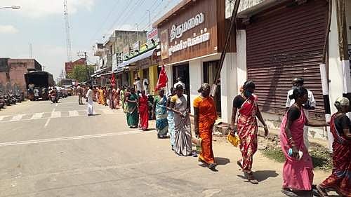 பேரணியாக சென்ற பெண் தொழிலாளர்கள் .
