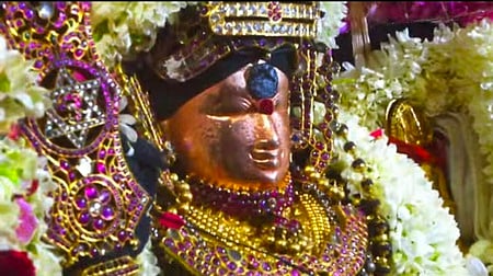 சிக்கல் கோயிலில் புதன்கிழமை இரவு நடைபெற்ற வேல் வாங்கும் நிகழ்வின்போது சிங்காரவேலா் முகத்தில் அரும்பிய வியா்வை துளிகள்.