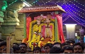 திருவாரூா் தியாகராஜா் கோயிலிலிருந்து வீதியுலாவுக்கு சிவகாமி அம்மையாருடன் புறப்பட்ட நடராஜா்.