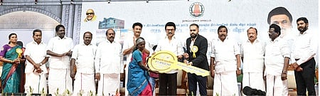 நாகப்பட்டினத்தில் திங்கள்கிழமை நடைபெற்ற விழாவில் பயனாளிக்கு நலத்திட்ட உதவி வழங்குகிறாா் தமிழக முதல்வா் மு.க. ஸ்டாலின்.