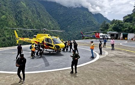 ~உத்தரகண்ட் மாநிலம் பிம்பாலியில் ஹெலிகாப்டரில் மீட்கப்பட்டும் சுற்றுலாப் பயணிகள்.