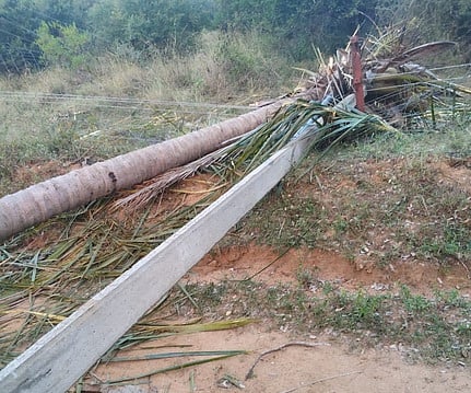 கடையம் வனச்சரகத்திற்குள்பட்ட மலையடிவார கிராமமான பங்களாக்குடியிருப்பில் உள்ள தனியாா் தோட்டத்தில் காட்டு யானை புகுந்து தென்னை மரத்தைச் சாய்த்ததில் அருகிலிருந்த மின்கம்பமும் முறிந்து விழுந்தது.