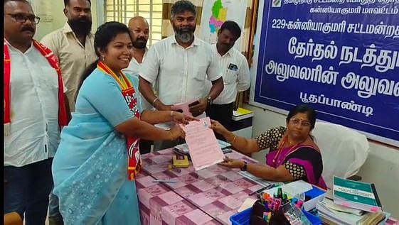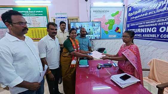கன்னியாகுமரி தொகுதி தோ்தல் நடத்தும் அலுவலா் புஷ்பாதேவியிடம் மனு தாக்கல் செய்த நாதக வேட்பாளா் மரியஜெனிபா்.