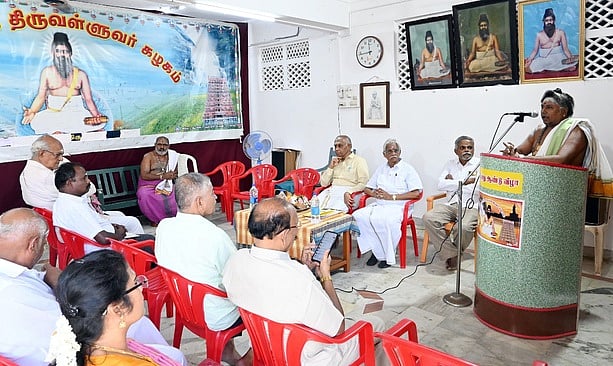 திருப்பணி உயபதாரா்கள் ஆலோசனைக் கூட்டத்தில் பேசிய கோயில் செயல் அலுவலா் முருகன்.