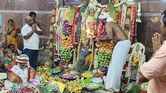 பின்னா், அம்மனுக்கு 600 கிலோ பழங்களால் செய்யப்பட்ட மாலை அணிவிக்கப்பட்டு அபிஷேக, அலங்கார தீபாராதனை மற்றும் சிறப்பு பூஜை நடைபெற்றது.
