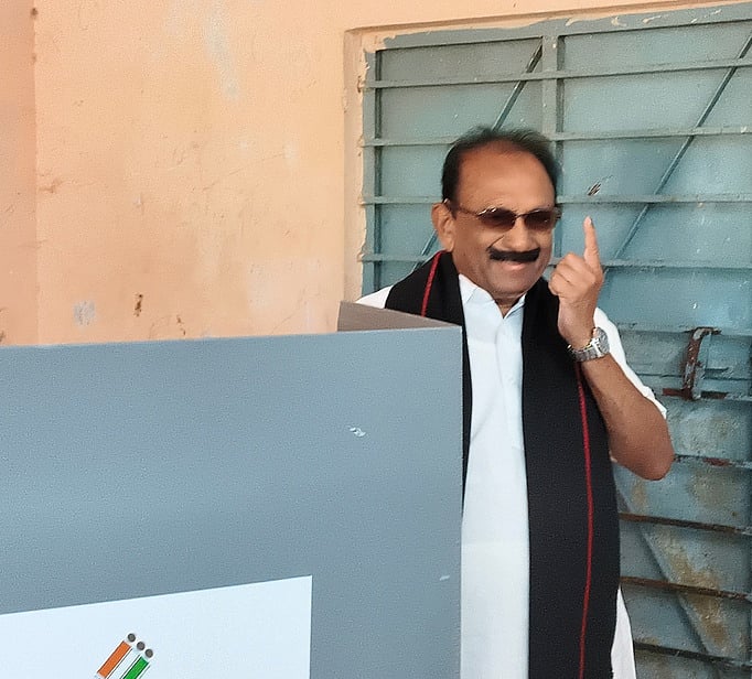 கலிங்கப்பட்டியில் வாக்குப் பதிவு செய்த மதிமுக பொதுச்செயலா் வைகோ.