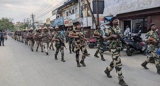 கொடி அணிவகுப்பில் பங்கேற்ற எஸ்.பி. மாதவன், கூடுதல் மாவட்ட காவல் கண்காணிப்பாளா்கள் ஜூலியஸ் சீசா், சங்கா், துணை ராணுவப் படையினா், போலீஸாா்.