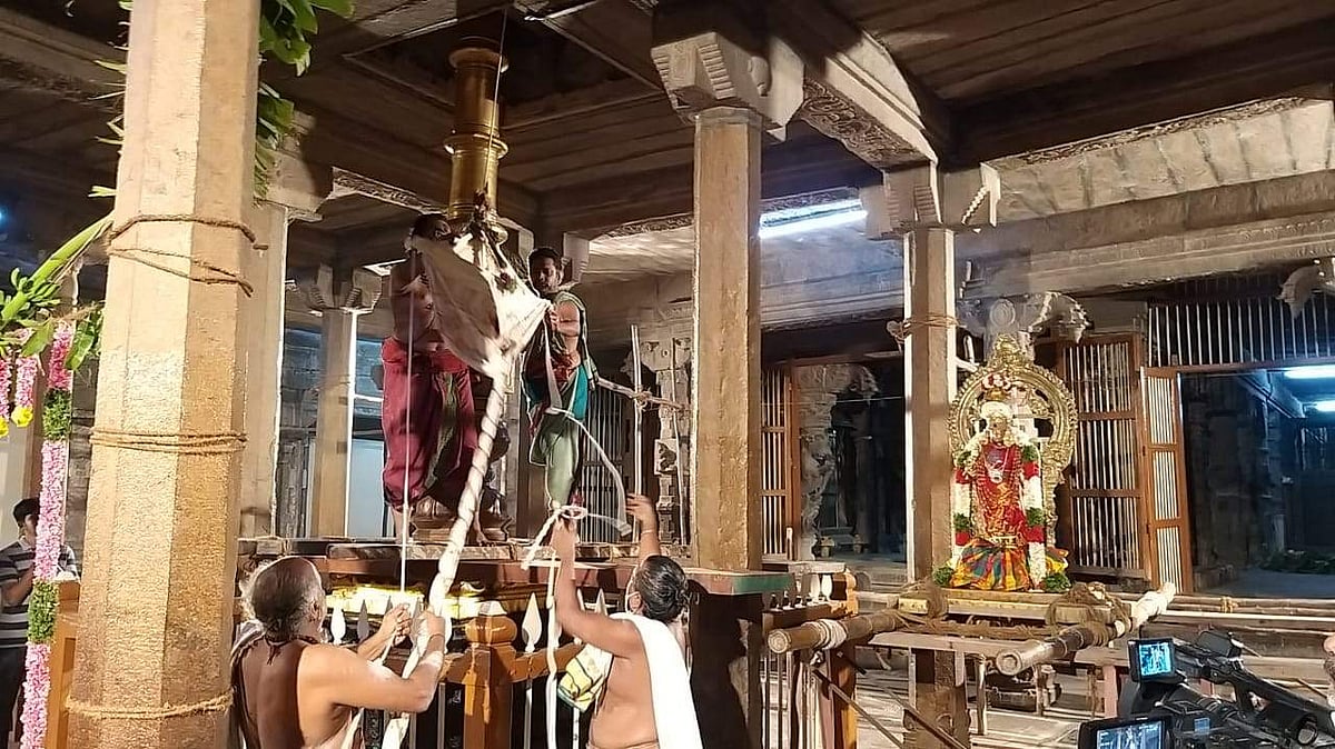 மேலும், இந்து முன்னணி உள்ளிட்ட இந்து அமைப்புகள், அரசியல் கட்சியினர் வெள்ளிக்கிழமை தர்ணா போராட்டத்தில் ஈடுபட்டனர். தொடர்ந்து, இது தொடர்பாக கோயில் நிர்வாகத்துடன் பேச்சுவார்த்தை நடைபெற்றது. பேச்சுவார்த்தையின் முடிவில், உள் பிரகாரங்களில் வீதி உலா நடைபெற்று, திருக்கல்யாணம் நடத்தப்படும் என கோயில் நிர்வாகம் தரப்பில் தெரிவிக்கப்பட்டது.