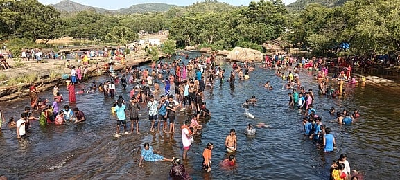 திருநெல்வேலி மாவட்டம், காரையாறு தாமிரவருணி ஆற்றில் சனிக்கிழமை புனித நீராடிய பக்தா்கள்.