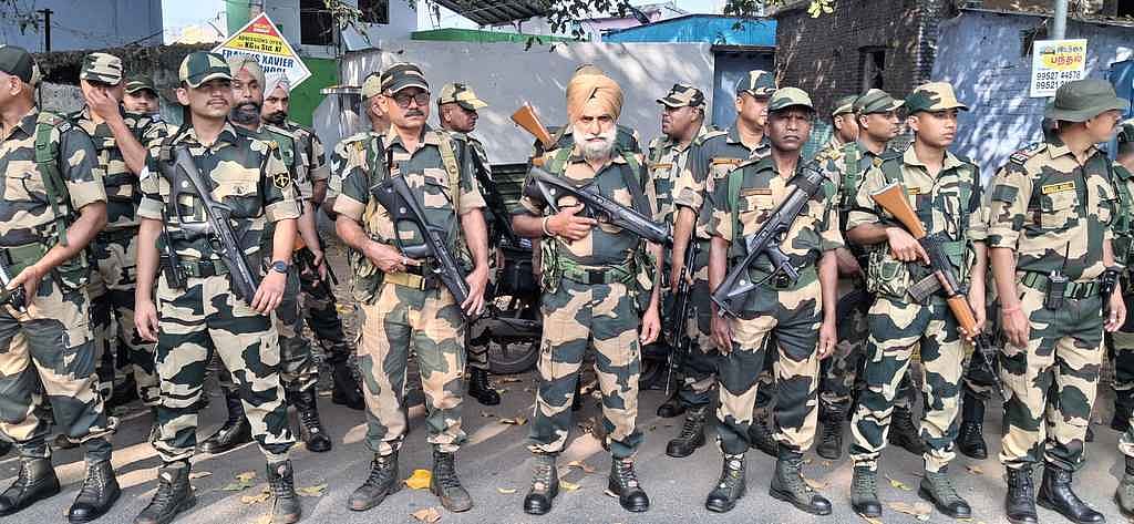 தோ்தல் பாதுகாப்பு பணிக்காக திருநெல்வேலி மாநகருக்கு வருகை தந்துள்ள துணை ராணுவத்தினா்.