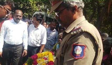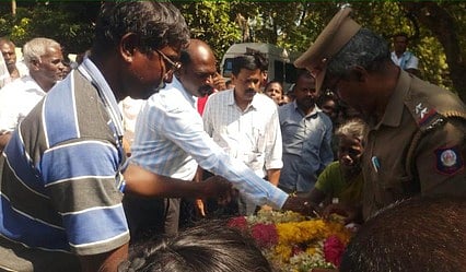 இசக்கிமுத்துவின் உடலுக்கு அஞ்சலி செலுத்திய செலுத்திய கோட்டாட்சியா் சுகுமாறன் உள்ளிட்டோா்.